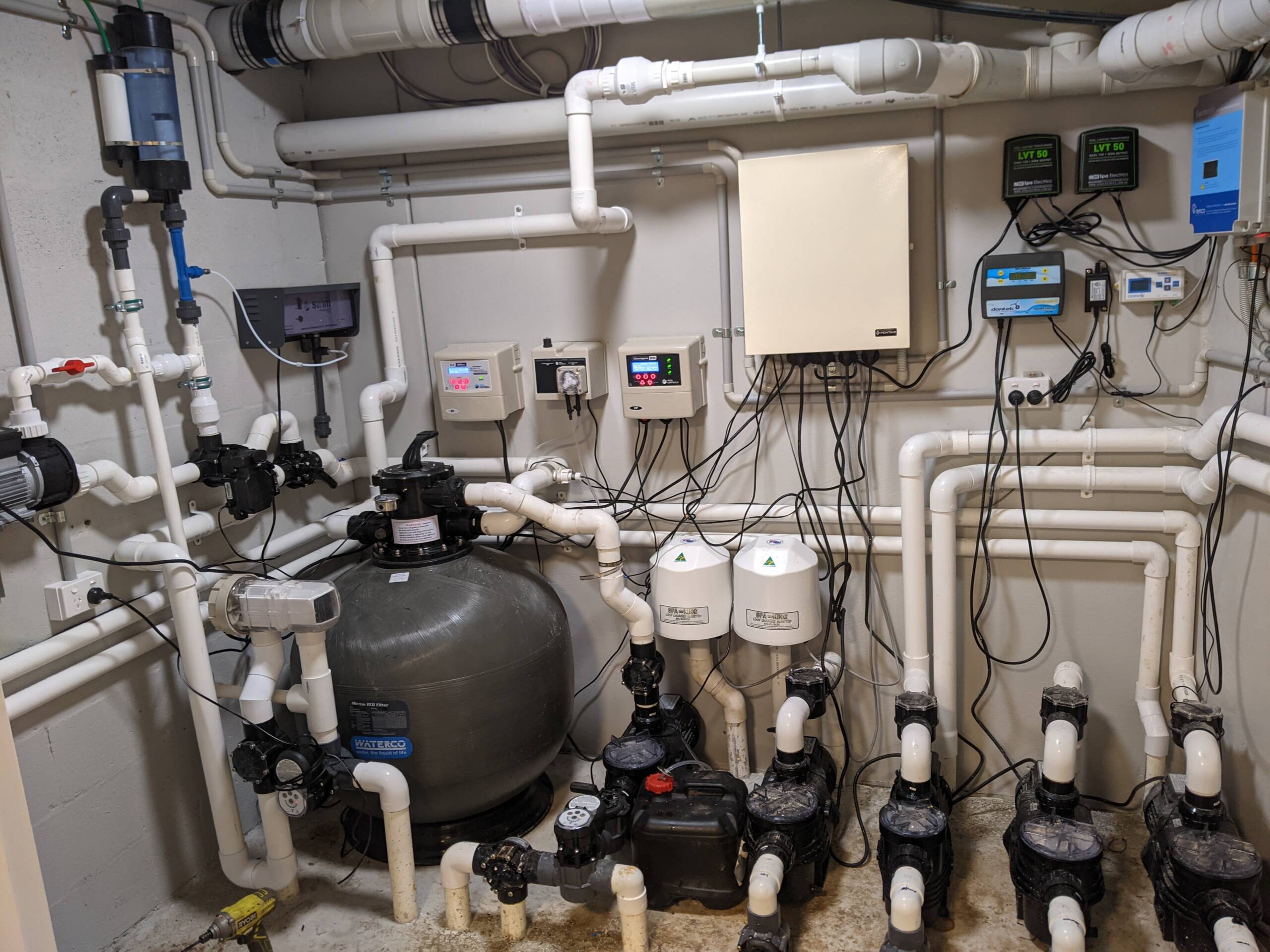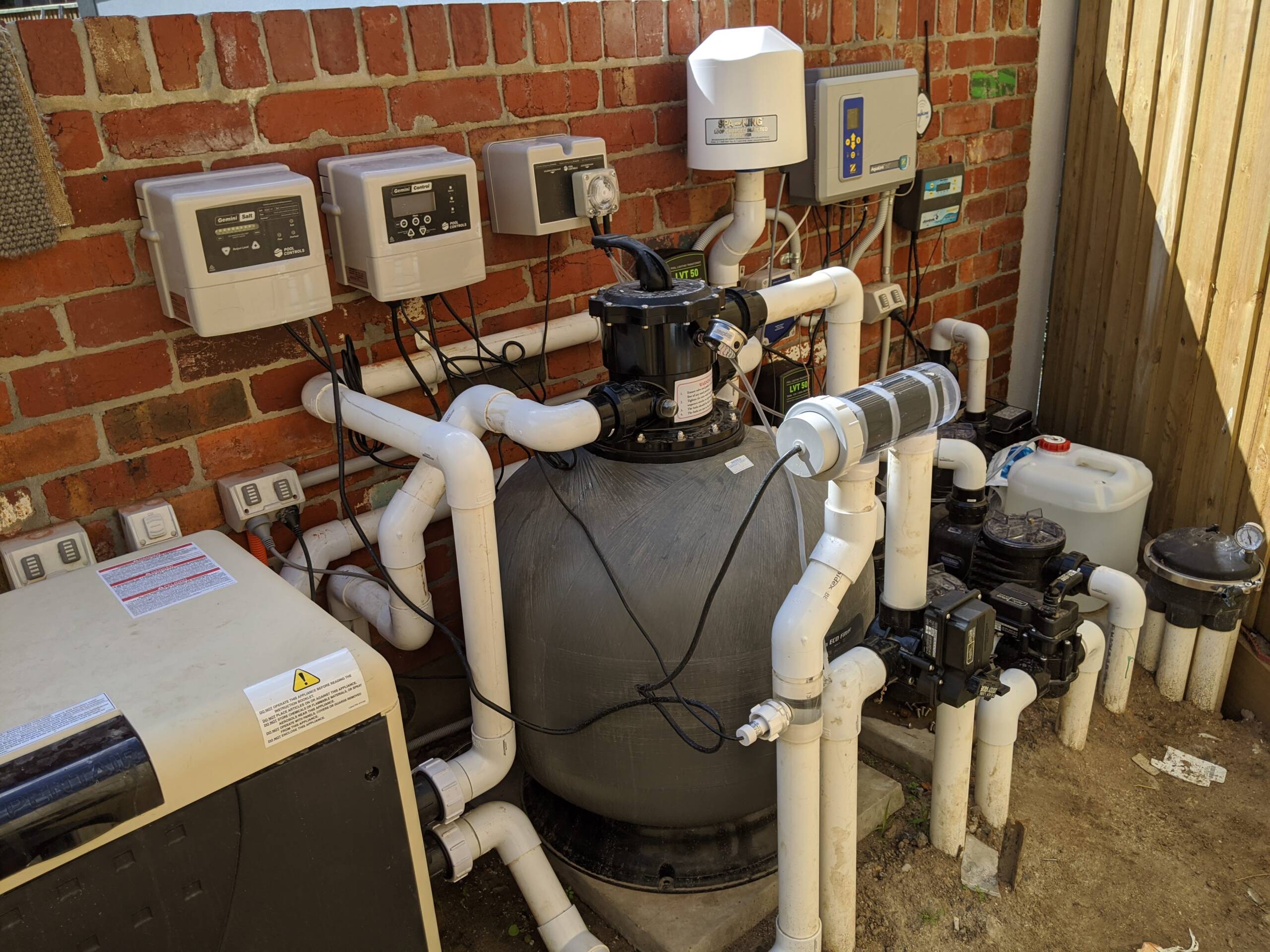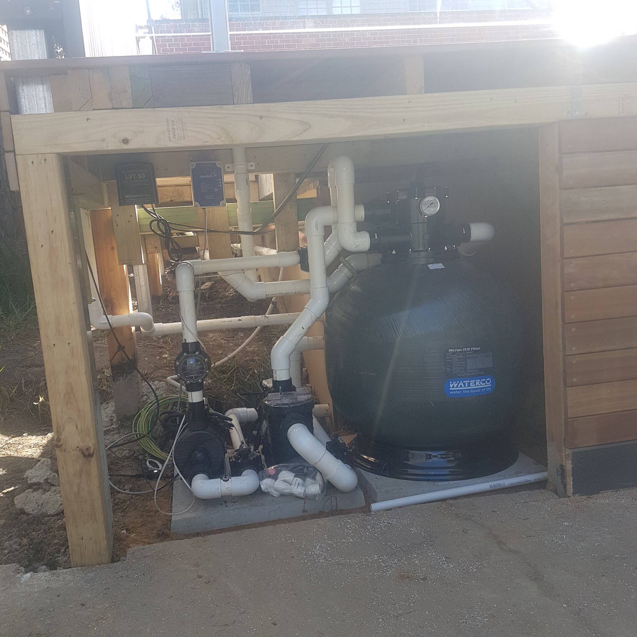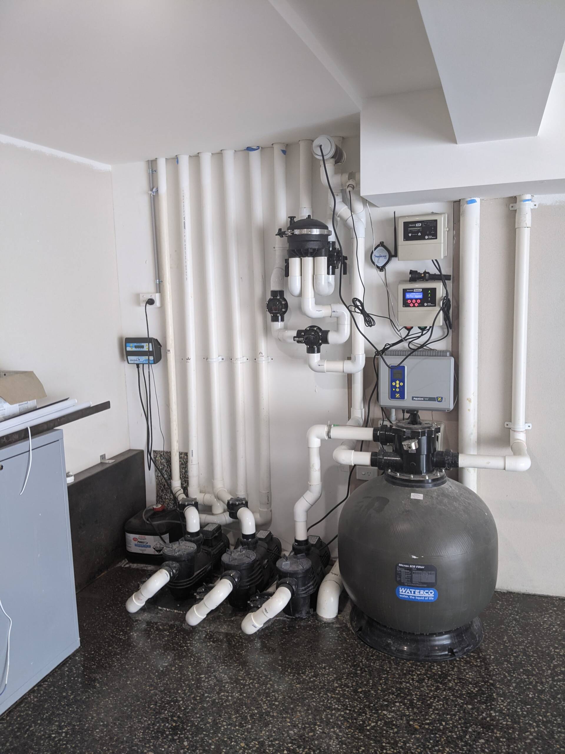 Pre planning the equipment layout at the start of any pool build is crucial to many contributing factors. Often the space allowed for by architects is not sufficient or may not work to regulations such as gas heater flues/clearances sewage connections… etc.. Its very important to not only configure the proposed equipment layout and preferred pipe run path to get there but also making sure that the pipe run and stand pipes are done as soon as possible straight after the shell construction. Sometimes its even done prior to shell construction depending on the site works schedule.